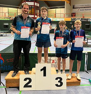 Zwei unserer Spieler aus der Jugend-Verbandsliga-Mannschaft (Felix und Tom) versuchten sich in dieser hohen Turnierklasse. Tom konnte mit Satzgewinnen einige Achtungserfolge erzielen, kam aber über die Gruppenphase in diesem Jahr noch nicht hinaus. Spannender konnte Felix seine Gruppe gestalten, in dem er einen Überraschungssieg gegen Hof (TTF Oranien Frohnhausen) landete und durch die bessere Satzdifferenz sogar als Gruppenzweiter in die KO-Phase einzog. Im Achtelfinale gelang Felix gleich der nächste Coup, in dem er Ulbricht (SV Erbach) mit 3:2-Sätzen niederrang. Im Viertelfinale war für den 14-Jährigen dann zwar Endstation, doch den herausragenden 5. Platz in der Herren-B-Konkurrenz kann ihm nun keiner mehr nehmen.