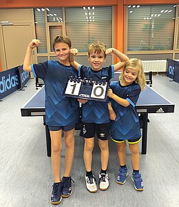 Bereits am Freitagabend empfing unsere dritte Ju15-Mannschaft den TTC aus Oberbrechen. Da die Gäste nur mit 3 Spielern antraten, wurde nur ein Doppel zu Beginn der Partie gespielt. Dieses gewannen Lio und Fabian ohne Satzverlust zur 1:0-Führung. Im weiteren Verlauf musste das Team aus Oberbrechen die Überlegenheit von Lio (3), Fabian (2), Jasmin (2) und Aeneas (1) in den Einzeln anerkennen. Der deutliche Sieg und die damit verbundenen zwei Punkte verhelfen unserem Team zu einem großen Sprung auf Platz 3 in der Tabelle.