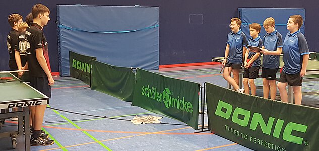 Nach zwei knappen Sätzen gewannen Ben Bandyla und Ben Giese auch den dritten Satz des Eröffnungsdoppels und bereiteten so einen guten Start in das um 17.30 Uhr begonnene Match. Doch die DJK schlug direkt in Person von Kira Brahm zurück und gewann gegen Ben Bandyla in drei Sätzen. Doch dann legten unsere 13er erst richtig los - mit 5 Einzelsiegen in Folge zeigten Ben Giese (2), Jona Emmerich (2) und Ben Bandyla (1) ihr Können. Zwar musste auch Ben Giese die Leistung von Kira Brahm anerkennen, die in dieser Begegnung erneut zum 6:2-Zwischenstand punkten konnte, aber Jona Emmerich und Ben Bandyla ließen danach keinen Zweifel mehr aufkommen, wer in dieser Hinrundenpartie die Oberhand behalten sollte.