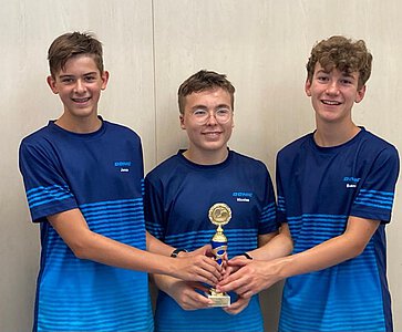 Im Finale folgte dann ein wahrer Krimi gegen die Mannschaft von Oberzeuzheim. Jonas musste sich zunächst gegen Heun geschlagen geben und auch Nicolas musste Meuser nach 4 Sätzen zum Sieg gratulieren. Also stand es nach 2 Spielen 0:2 gegen uns. Doch noch gab das Team nicht auf: Benjamin gewann mit 3:2 gegen Lippitz und verkürzte auf 1:2. Das darauffolgende Doppel verloren Jonas und Nicolas nach vielen spannenden Bällen leider auch mit 1:3. Nun war klar, dass beim Spielstand von 1:3 alle Spiele gewonnen werden mussten.