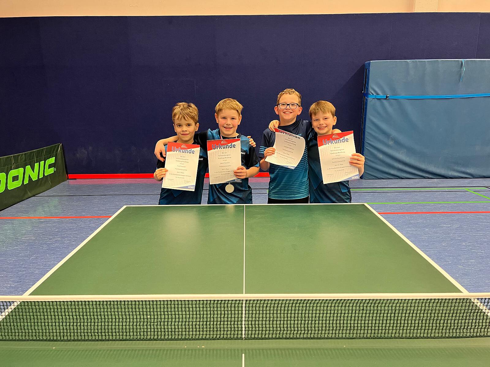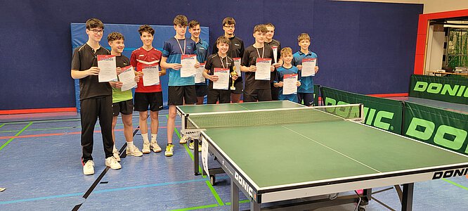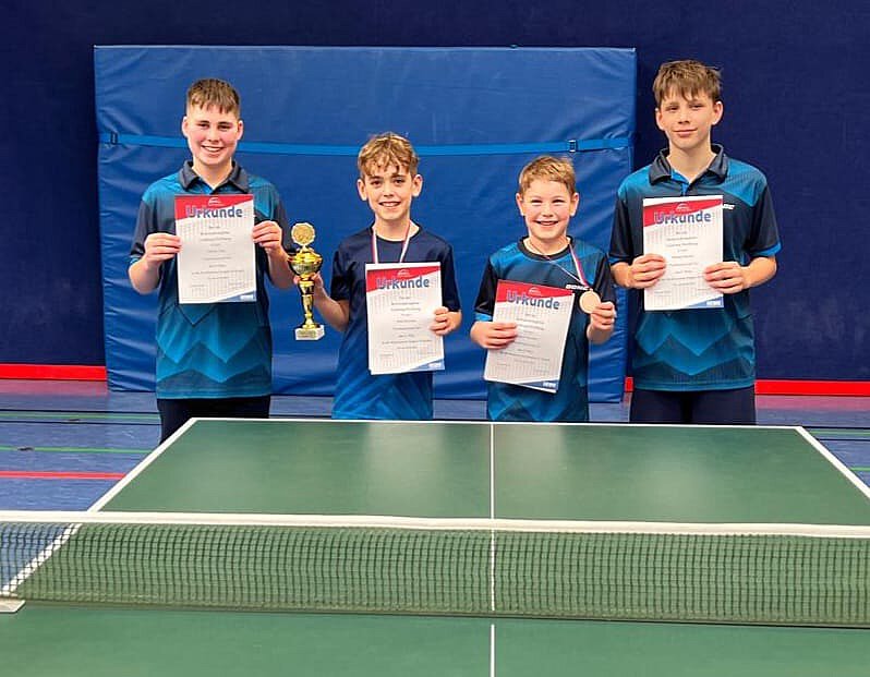Felix überzeugte mit 8:2 Siegen in der Konkurrenz J 19 auf der ganzen Linie und erkämpfte sich Platz 2 hinter Luca Heun (TTF Oberzeuzheim), der mit 9 Siegen bei einer Niederlage das Turnier gewann. Eine sehr gute 8:2-Bilanz erzielte auch Lennart. Aufgrund des etwas schlechteren Satzverhältnisses blieb er hinter Mannschaftskamerad Felix auf Platz 3. Fred – als Elfjähriger mit einigen 7 Jahre älteren Gegnern konfrontiert - spielte auch in dieser Altersklasse beeindruckend stark mit (Platz 7!), Jonas wurde Achter und Philipp belegte Platz 11.